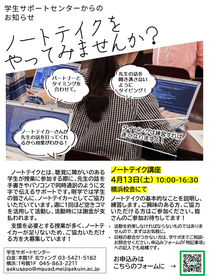 「ノートテイク」とは、聴覚に障がいのある学生が授業等に参加する際に、先生の話を手書きやパソコンで同時通訳のように伝えるサポートです。 今回以下の日程でノートテイク基本を学ぶ「ノートテイク講座」を開催しますので、興味のある方はぜひ参加してみてください! ★★★今回はこんな方を特に大募集しています!!★★★ |