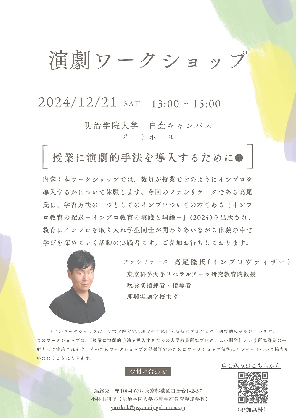 | 内容:本ワークショップでは、教員が授業でどのようにインプロを導入するかについて体験します。 今回のファシリテータである高尾氏は、学習方法の一つとしてのインプロついての本である『インプロ教育の探求-インプロ教育の実践と理論-』(2024)を出版され、教育にインプロを取り入れ学生同士が関わりあいながら体験の中で学びを深めていく活動の実践者です。 大学教職員のご参加をお待ちしております。 ファシリテータ:高尾隆氏(インプロヴァイザー) 東京科学大学リベラルアーツ研究教育院教授 吹奏楽指揮者・指導者 即興実験学校主宰 ※このワークショップは、明治学院大学心理学部付属研究所特別プロジェクト研究助成を受けています。 このワークショップは、「授業に演劇的手法を導入するための大学教員研究プログラムの開発」という研究課題の一環として実施されます。そのためワークショップの効果測定のためにワークショップ前後にアンケートへのご協力をいただくことになります。 ご参加の方はこちらのフォームからお申し込みください。 ※本プログラムは大学教職員のみ対象です。 |