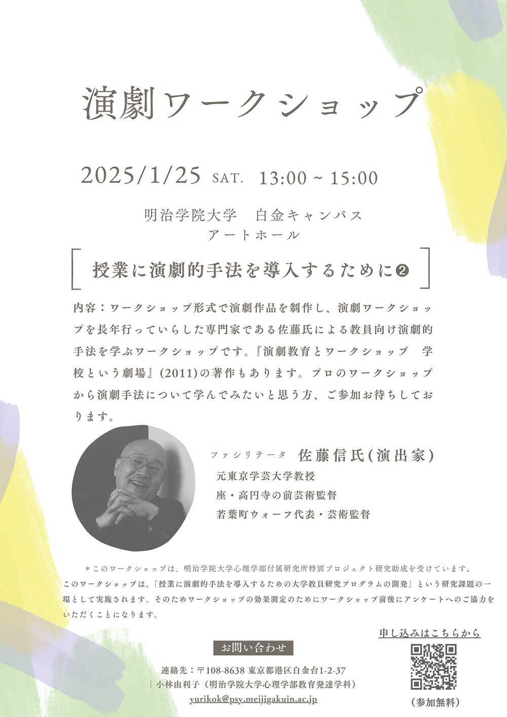 内容:ワークショップ形式で演劇作品を制作し、演劇ワークショップを⻑年⾏っていらした専⾨家である佐藤⽒による教員向け演劇的⼿法を学ぶワークショップです。『演劇教育とワークショップ 学校という劇場』(2011)の著作もあります。プロのワークショップから演劇⼿法について学んでみたいと思う大学教職員のご参加お待ちしております。ファシリテータ:佐藤信⽒(演出家)元東京学芸⼤学教授座・⾼円寺の前芸術監督若葉町ウォーフ代表・芸術監督※このワークショップは、明治学院大学心理学部付属研究所特別プロジェクト研究助成を受けています。このワークショップは、「授業に演劇的手法を導入するための大学教員研究プログラムの開発」という研究課題の一環として実施されます。そのためワークショップの効果測定のためにワークショップ前後にアンケートへのご協力をいただくことになります。ご参加の方はこちらのフォームからお申し込みください。※本プログラムは大学教職員のみ対象です。