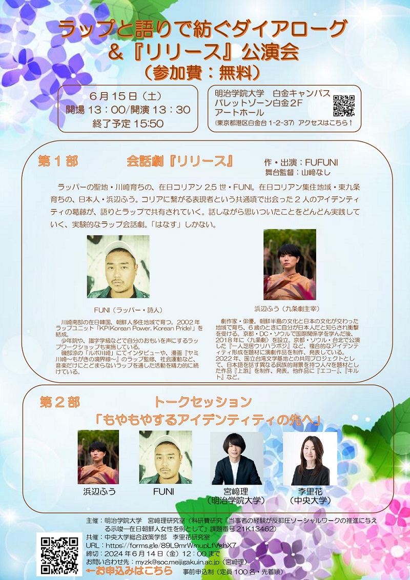 | 第2部 | トークセッション『もやもやするアイデンティティの先へ』 浜辺ふう(九条劇主宰) FUNI(ラッパー・詩人) 宮﨑理(明治学院大学 社会学部 准教授) 李里花(中央大学 総合政策学部 教授) |