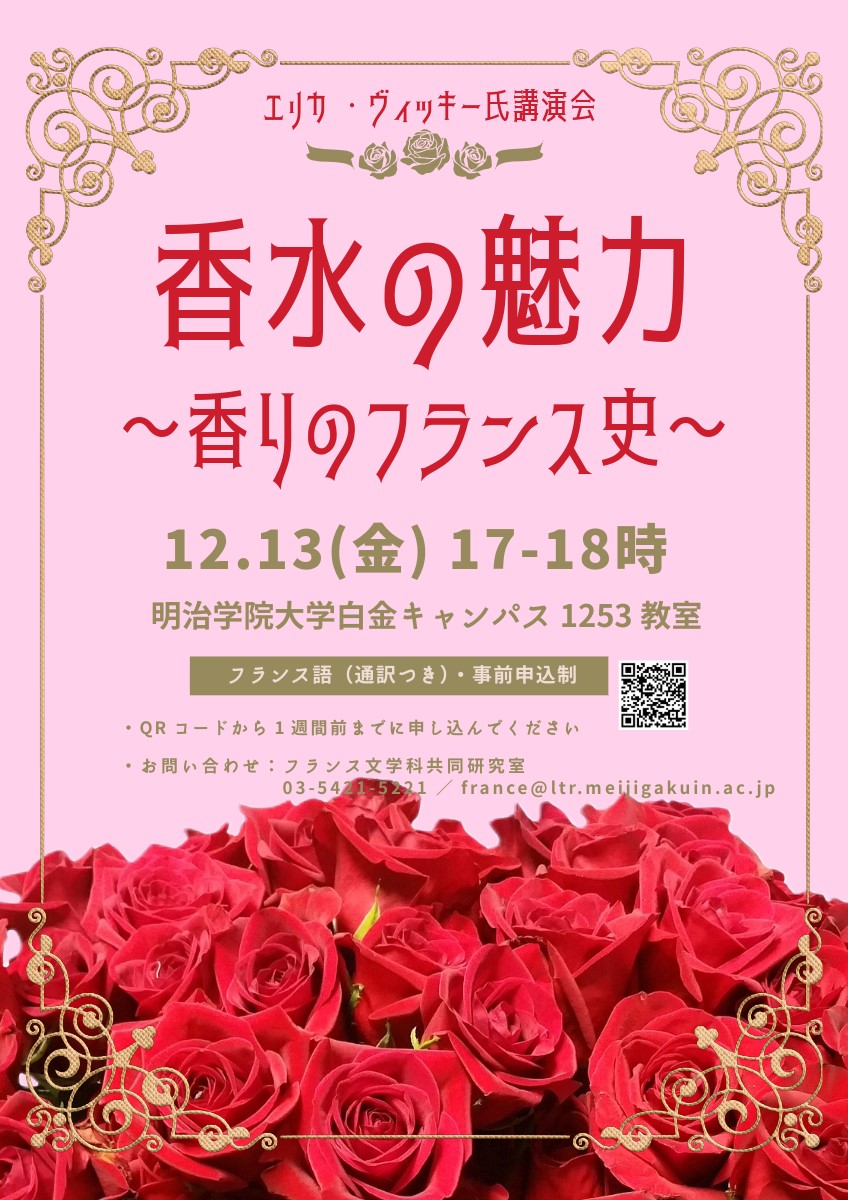 全て エリカ・ヴィッキー氏講演会「香水の魅力 ~香りのフランス史~」開催のお知らせ 2024.11.12 香水の魅力 ~香りのフランス史~ 下記の日程でエリカ・ヴィッキー氏による講演会を開催いたします。「香水の魅力 ~香りのフランス史~」♦日時:2024年12月13日(金) 17:00~18:00♦場所:明治学院大学白金キャンパス 1253教室♦フランス語(通訳つき)♦事前申込制「香水の名前はどうやってつけているの?」「幻の香水、どんな香り?」「うそ、ゲランの香りつき新聞なんてあったの?」 事前申込期限は過ぎましたが、当日参加も大歓迎です。どうぞ皆様お越しください! お知らせ一覧へ戻る ホーム お知らせ エリカ・ヴィッキー氏講演会「香水の魅力 ~香りのフランス史~」開催のお知らせ