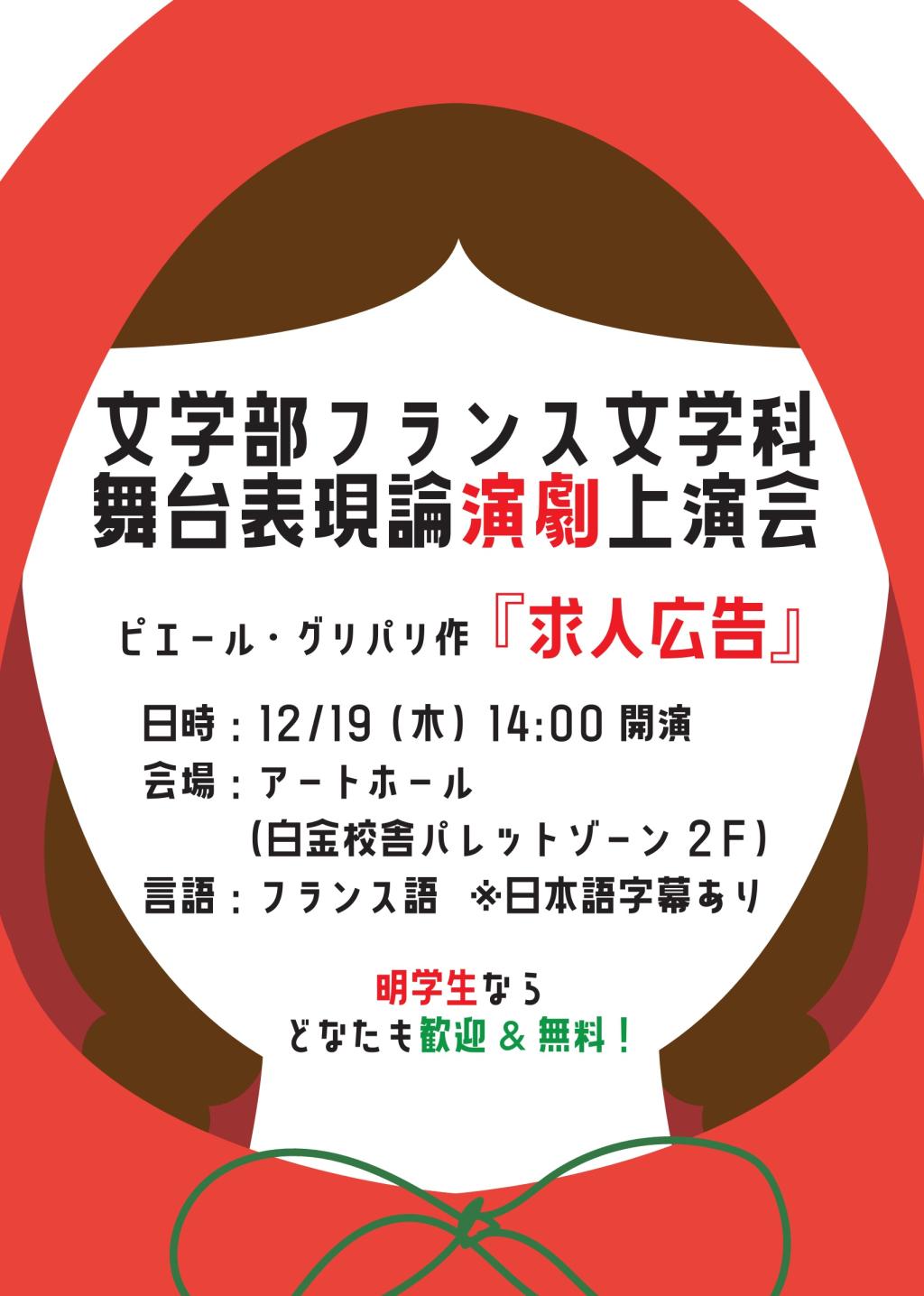 在学生 12/19 演劇上演会のお知らせ 2024.12.16 演劇上演会のお知らせ 以下の日程で演劇上演会を行います。フランス文学科の鈴木和彦先生の授業「舞台表現論」の学生による舞台です。明学生ならどなたでも歓迎、無料です!ぜひお越しください!♢ピエール・グリパリ作『求人広告』♢日時:2024年12月19日(木) 14:00開演♢場所:白金校舎パレットゾーン2階 アートホール♢言語:フランス語 ※日本語字幕あり お知らせ一覧へ戻る ホーム お知らせ 12/19 演劇上演会のお知らせ