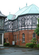 明治学院記念館島崎藤村が小説『桜の実の熟する時』の中で、 設計は、H.M.ランデイス教授といわれている。赤煉瓦、瓦葺きの2階建てで、当時アメリカで流行したネオゴシック様式。延面積は約516平方メートル。 1894年(明治27年)6月の大地震で大破し、2階部分を木造に改造。木造部分は木材の骨組を真壁にし木骨を表に出し、煉瓦と木造との連繋構造は妙をえて高い評価を受けている。尖塔は1914年(大正3)のサンダム舘の火災時に類焼して改造されたもの。1923年(大正12年)の関東大震災では煉瓦の大煙突が崩壊、1966年(昭和41年)国道1号線(桜田通り)の道路拡張のため、現在地に移動復元した。1979年(昭和54年)東京都港区の指定文化財となった。 現在は、一階は小チャペル、学院牧師室、宗教部が利用し、二階は明治学院歴史資料館と、展示室、会議室に利用されている。 |