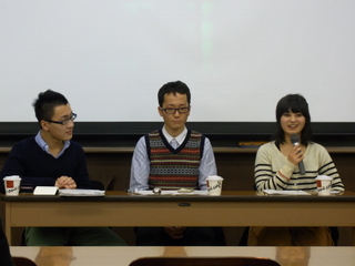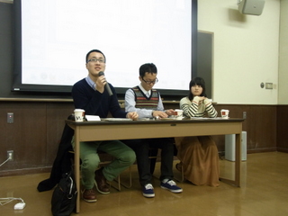 この報告会は、マスコミクラス出身で、マスコミ業界へと就職が決まった4年生3名が企画し、パネルディスカッション・相談形式で行われました。