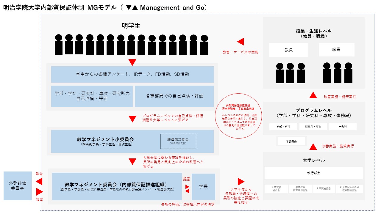 明治学院大学では、2024年度より、内部質保証方針にもとづき「MGモデル(▼▲Management and Go)」と呼ぶ体制の中で、明学生を起点・終点とした、点検・評価と改善を一連のサイクルとして行なっています。