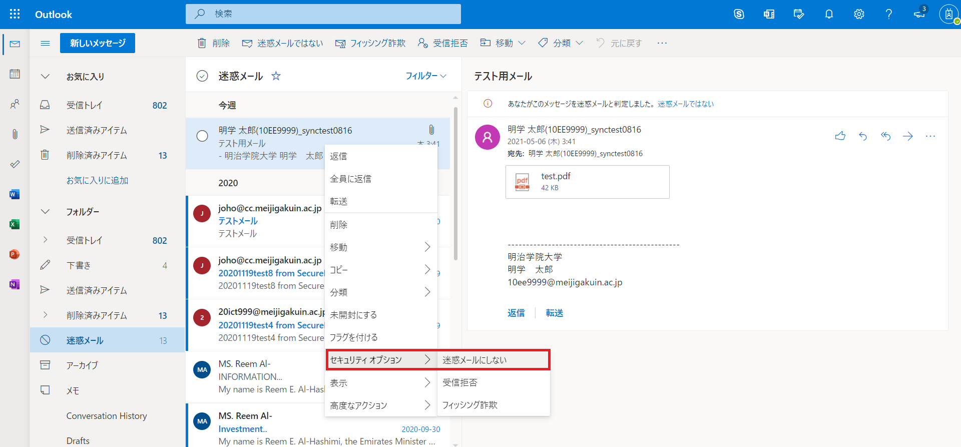 「迷惑メール」に格納されたメールを右クリックし、セキュリティオプション内、迷惑メールにしないをクリックします。