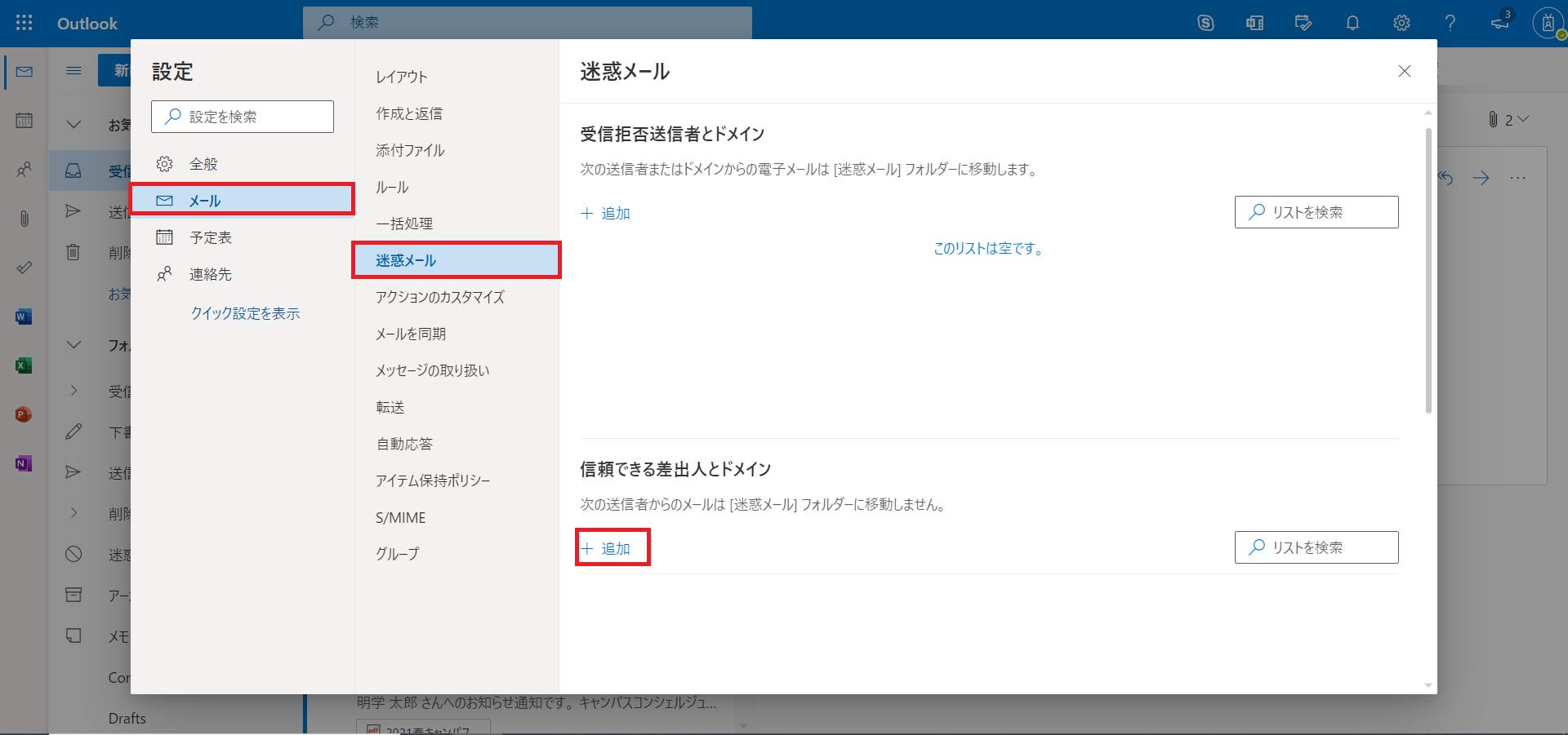 2.設定が表示されますので、メール、迷惑メールをクリックし、信頼できる差出人とドメイン内の「追加」をクリック