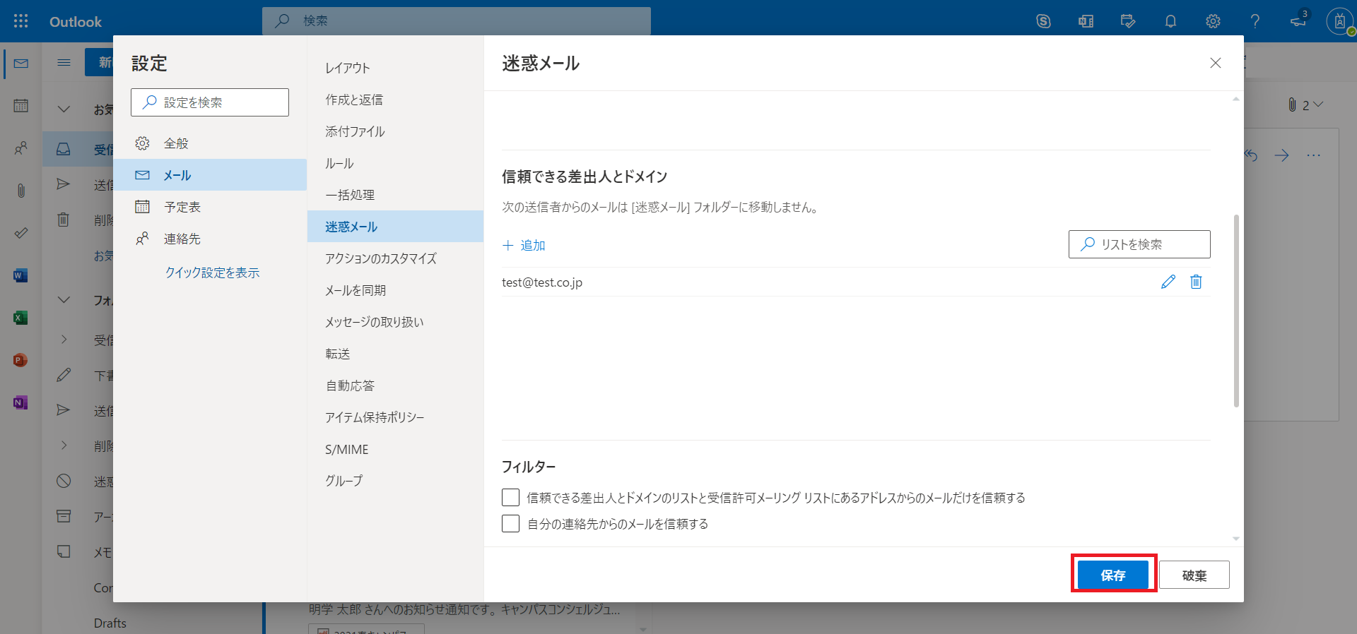 3.入力したメールアドレス(もしくはドメイン)、完了後に保存をクリック。