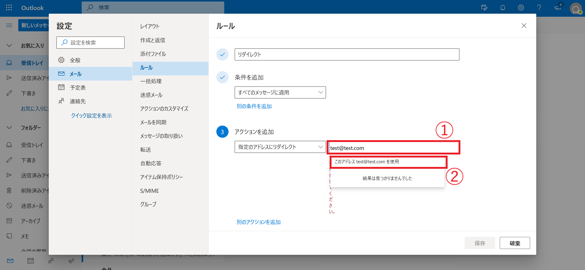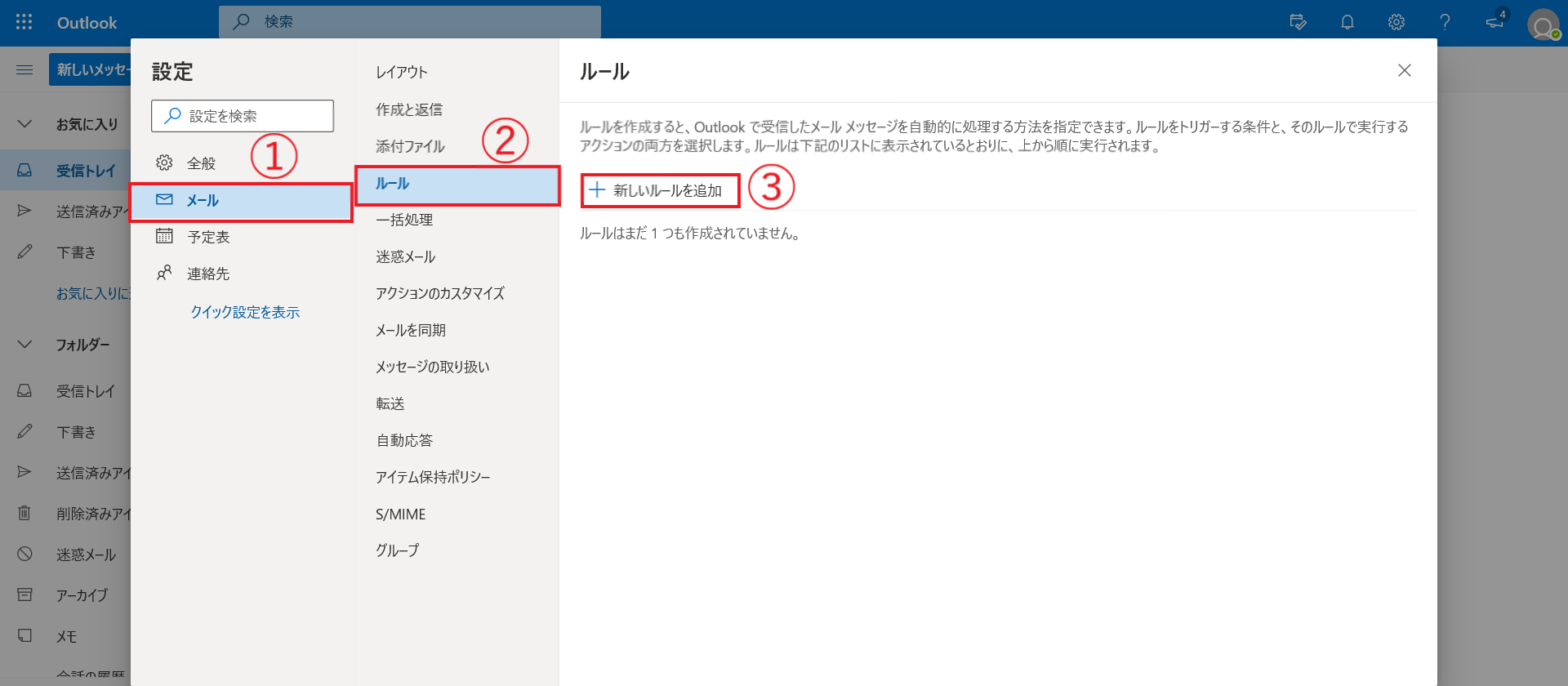 ①メール、②ルールの順番で選択し、③「+新しいルールを追加」を選択する。