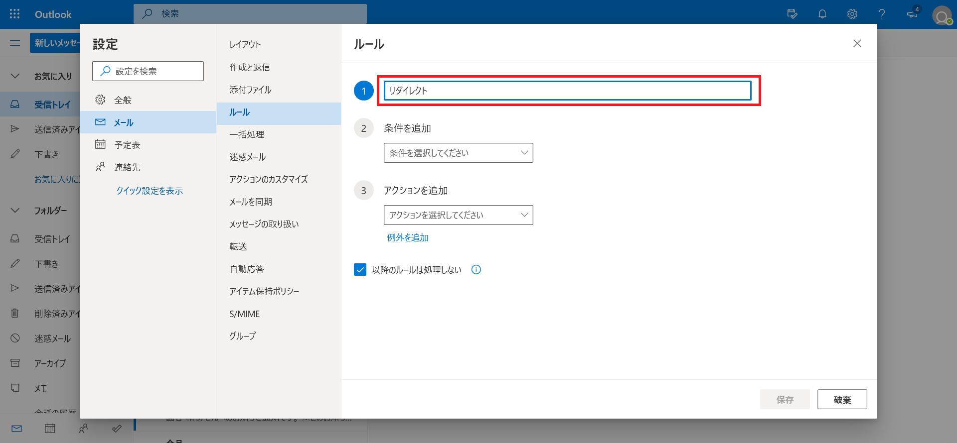 3.①に任意のルール名を入力する(本マニュアルではリダイレクトと入力)