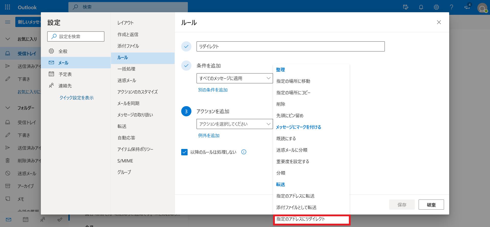 表示された選択肢の一番下「指定のアドレスにリダイレクト」を選択します。