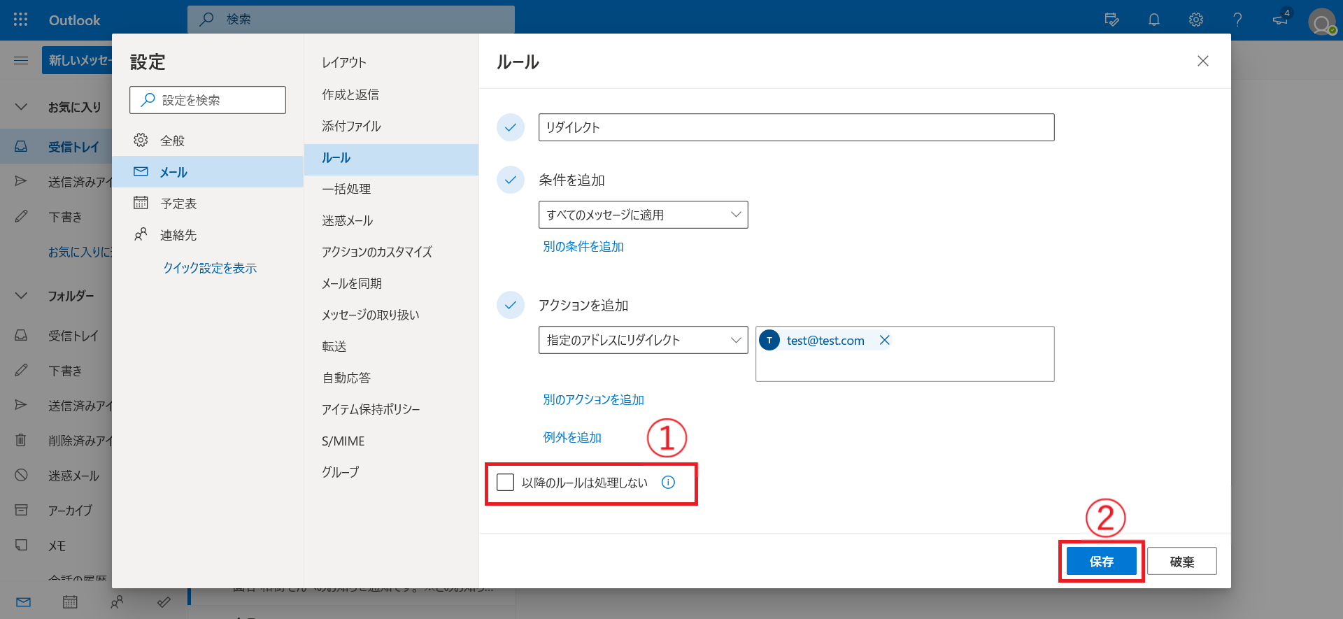 7.6.が完了後、①「□以降のルールは処理しない」のチェックを外し、②保存を選択します。