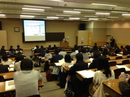 2012年12月15日(土)14:00から、指定校推薦入試、明治学院系列校入試の合格者を対象とした、「特別入試合格者説明会」が開かれました。 伊室学科主任教授から、法律を学ぶ意義、学生に期待すること、明学法律学科での学びの特徴などについて、説明を受けました。 続いて、入学までに国語と英語それぞれ2回の添削指導を受ける入学前教育についての説明がありました。 最後に3つのグループに分かれてキャンパス・ツアー(見学会)が行われました。