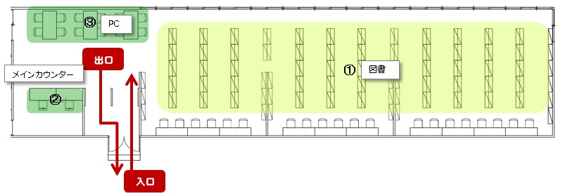 仮設図書館プレハブ棟のフロアガイドです。順番に中をご紹介します。