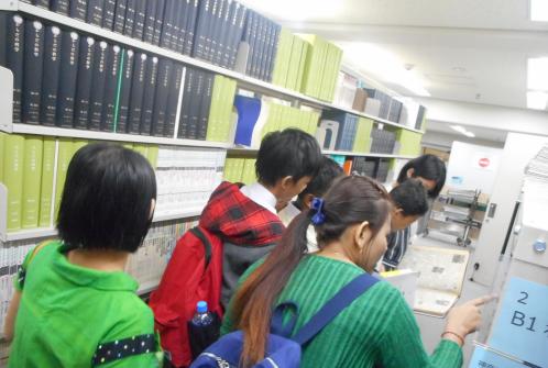 生徒たちは、多くの蔵書や機器に驚きつつ、見学を楽しんでいました。
