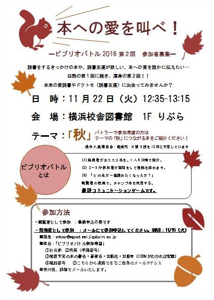 【横浜校舎図書館】明日開催!観覧できます!第2回 参加者募集!本への愛を叫べ!-ビブリオバトル2016