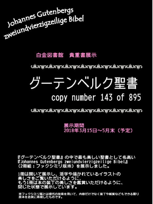 【白金校舎図書館】貴重書展示「グーテンベルク聖書 copy number 143 of 895」開催中です