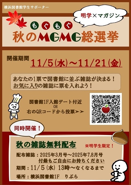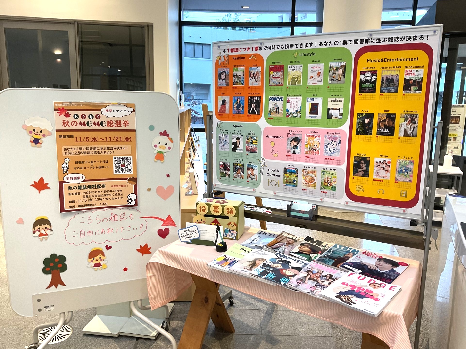 横浜図書館1Fりぶらにある雑誌37誌の人気投票、2025年度雑誌総選挙『秋のMGMG総選挙』を11月5日~ 11月25日に実施しました。