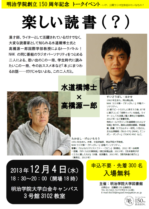 漫才師、ライターとして活躍されているだけでなく、大変な読書家として知られる水道橋博士氏と高橋源一郎国際学部教授によるトークバトル!NHKの同じ番組のラジオパーソナリティをつとめる二人による、思い出のこの一冊、学生時代に読みたいこの一冊、今のおススメ本など「本」にまつわるお話、、、、だけじゃないよね、この二人だと。