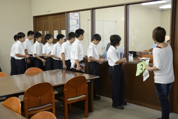 中学1年生144名のみなさんは、学生スタッフから大学生の勉強の仕方を聞いたり、貴重資料の展示コーナーで明治期のちりめん本に触れたり、地下の電動書架を操作したり…と、中学校とは違う大学の図書館に興味津々の様子でした。