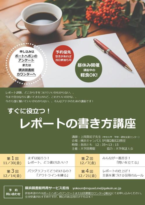 【横浜校舎図書館】「すぐに役立つ!レポートの書き方講座」11/30スタート!