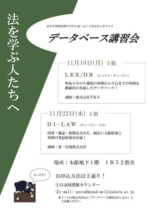 【白金校舎図書館】法律系データベース講習会のお知らせ
