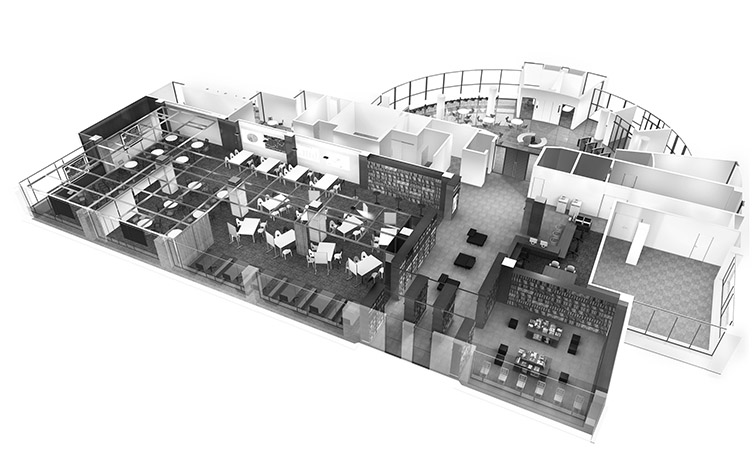 そこに居るだけで学びの原動力となる好奇心や探究心を刺激し、自ずと意欲やモチベーションが向上するような空間。そのために、扉を開けたときに別世界に足を踏み入れたかのような独創性を重視する。また「見る」「見られる」ことにより、学生同士が相互刺激を受け、「学びの伝播」が生まれるよう、空間の開放性、透明性を高めて可視化する。大学の学びの象徴としての蔵書の魅力を強調し、書架はスタイリッシュに重厚感を醸し出し、「本の森」の「ワクワク」感、迷いながらたどり着く過程で思いがけない本との出合いが生まれるデザインとする。