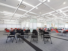 キャンパス中央に位置する図書館は、入口ホールにガラス面を多く使用し、広く、高く、明るい空間を形成。キャンパス同様白色を基調にした躯体に明るい木肌を使い、十分な天井高と豊かな採光による空間的余裕が図書館としての安らぎを出しています。