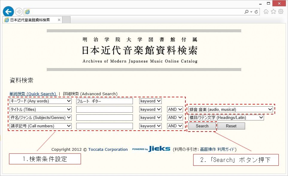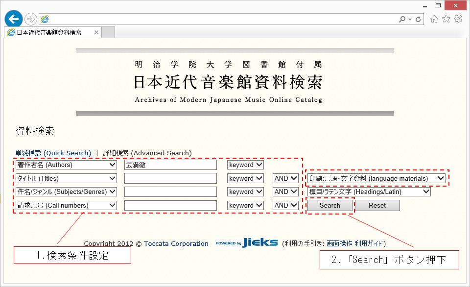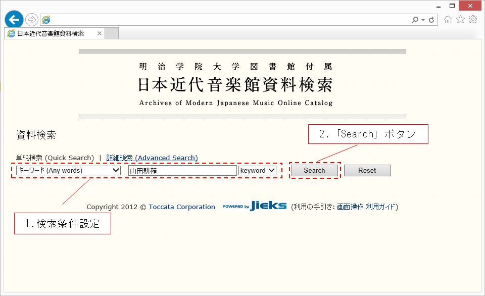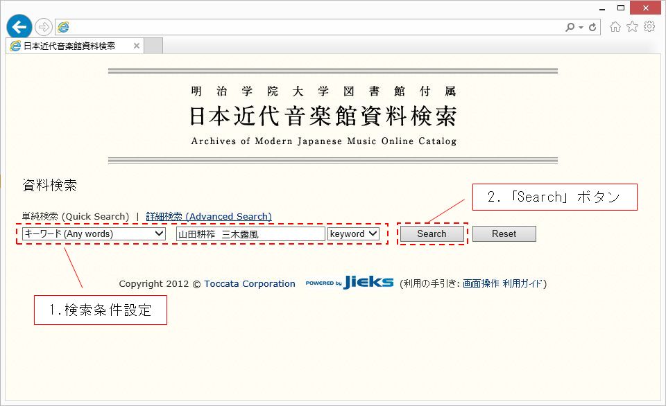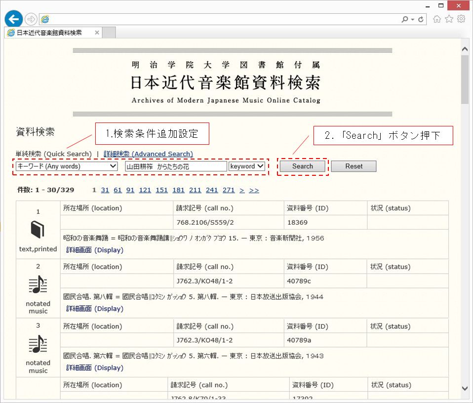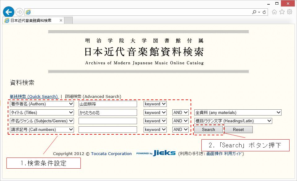 例1:「山田耕筰」の「からたちの花」というデータを詳細検索する場合