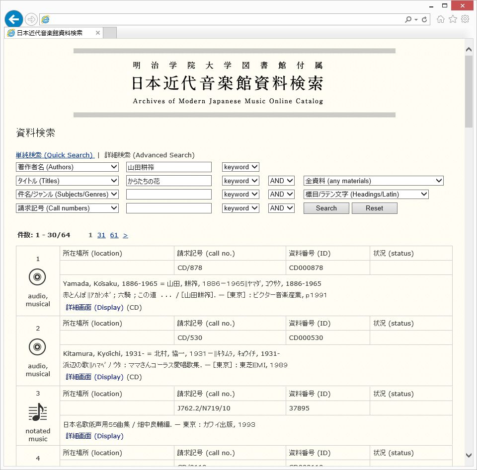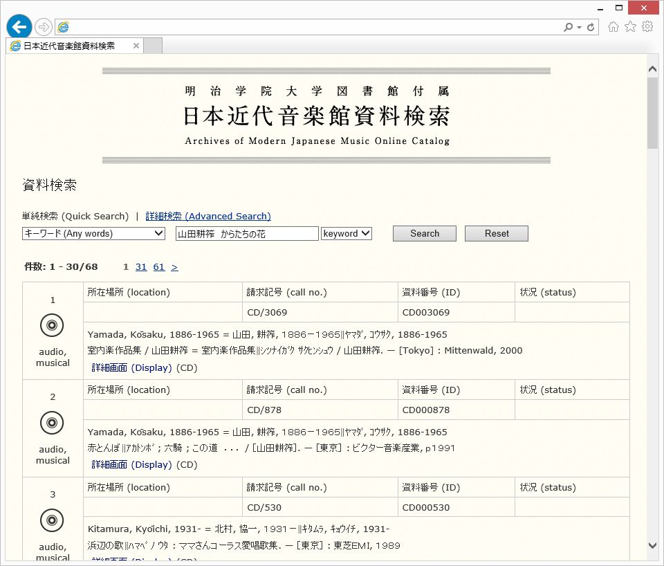 検索結果一覧画面が再表示され、書誌データのいずれかの項目に「山田耕筰」と「からたちの花」を含むデータが