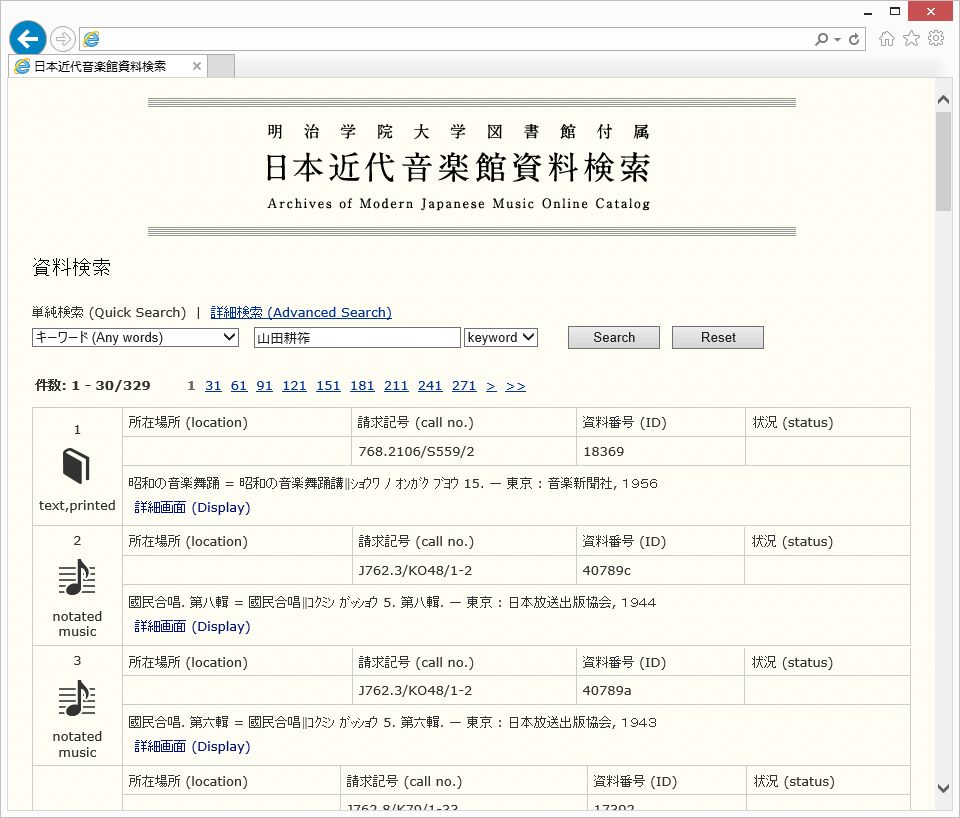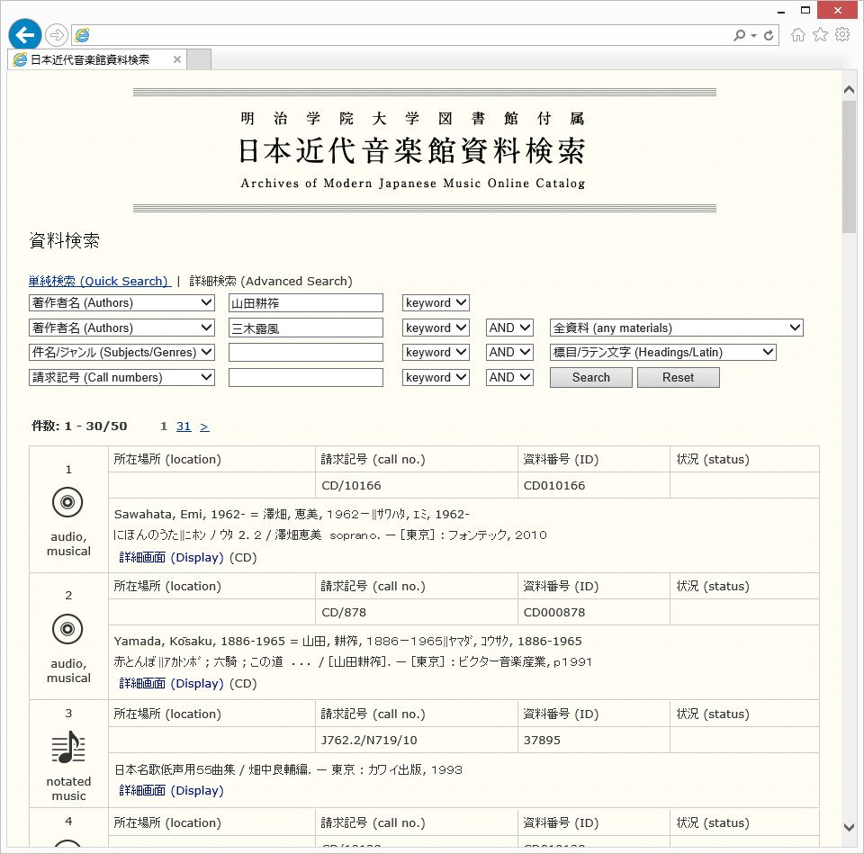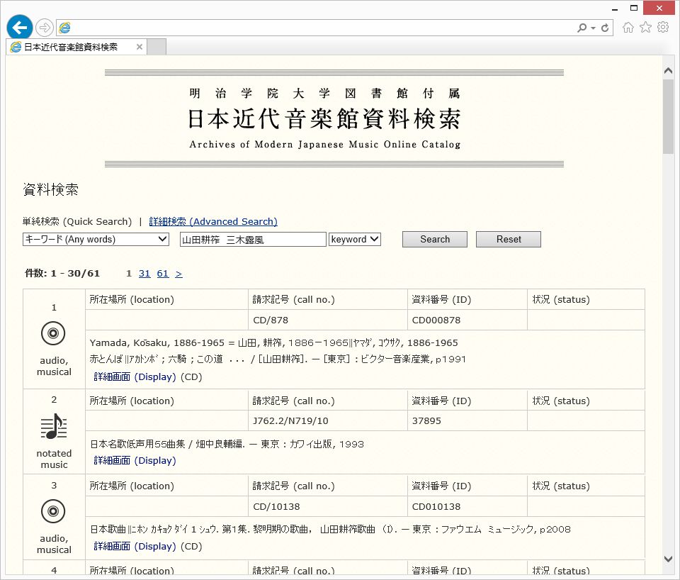 検索結果一覧画面に遷移し、書誌データのいずれかの項目に「山田耕筰」または「三木露風」を含む