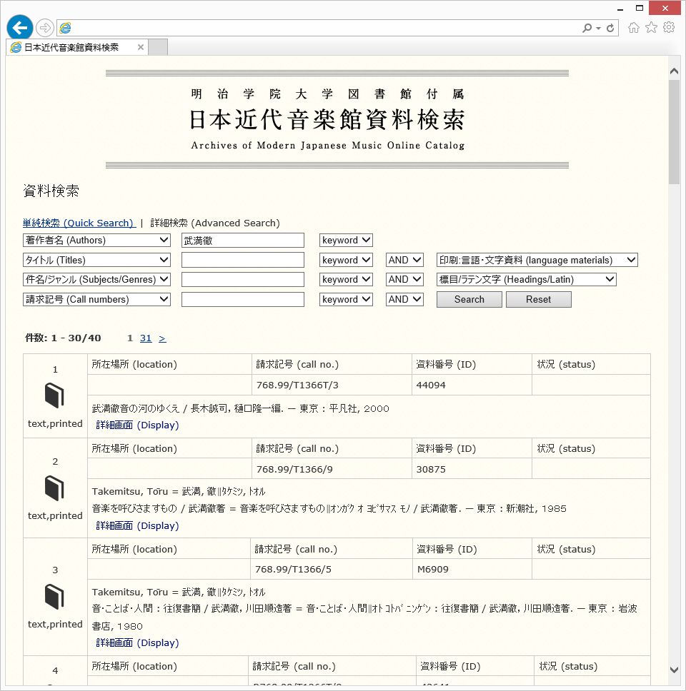 検索結果一覧画面に遷移し、武満徹の著書、武満徹に関する書籍のデータが一覧表示されます。