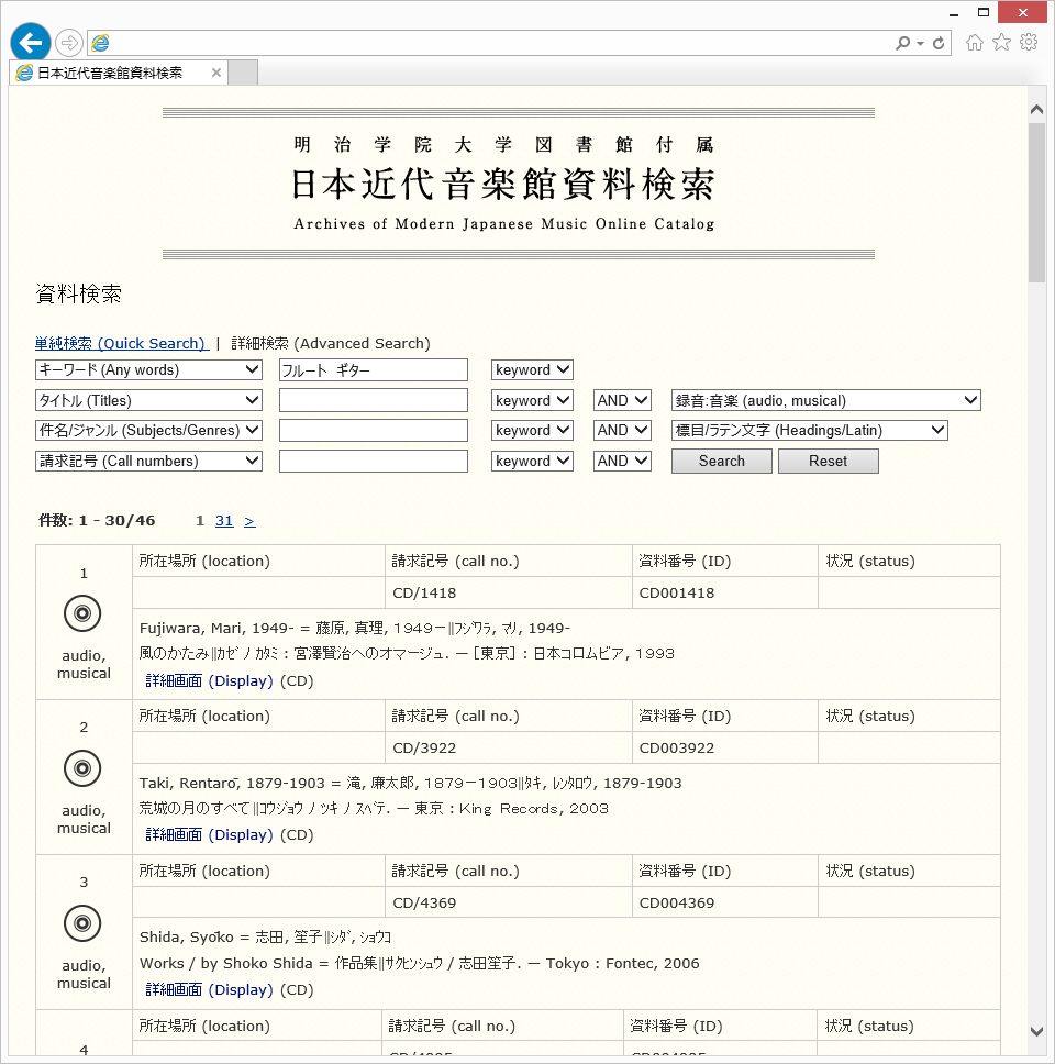 検索結果一覧画面に遷移し、書誌データのいずれかの項目に「フルート」または「ギター」を含む