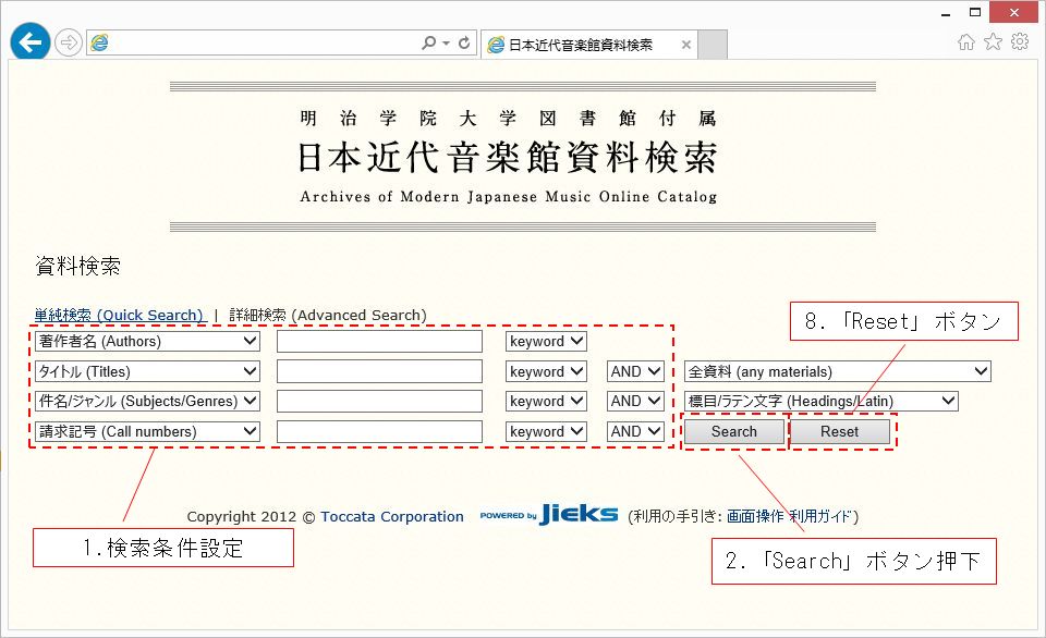 画面操作方法を確認したい時は、「画面操作」リンクをクリックして下さい。【日本近代音楽館資料検索の手引き ― 画面操作編】が表示されます。