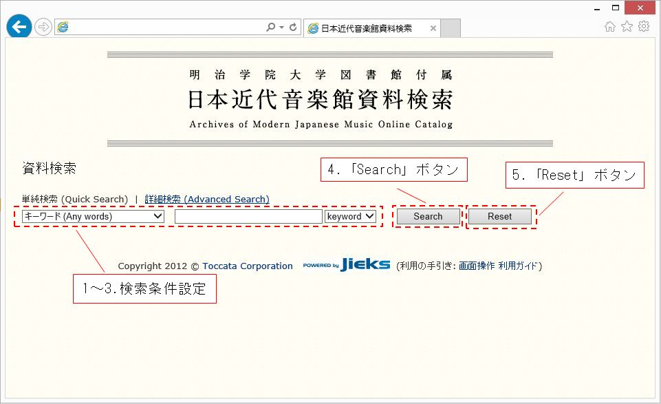 画面操作方法を確認したい時は、「画面操作」リンクをクリックして下さい。【日本近代音楽館資料検索の手引き ― 画面操作編】が表示されます。