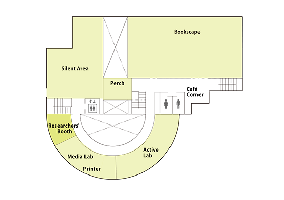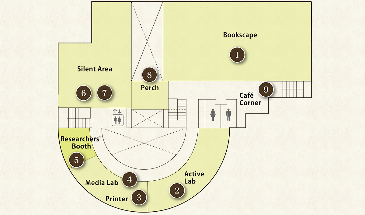 The bookshelves are designed to resemble a "forest of books" or a "maze of books.” Frequently used Japanese books and paperbacks are placed on the shelves. Reading seats have been provided for quiet use.