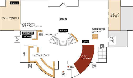 図書館の図書・資料を使いながら、グループで学習や発表の準備などができる部屋です。大型モニタ、ホワイトボードなどがあります。