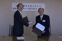 港区と明治学院大学は、互いに有する資源を活用し積極的に連携協力することにより、地域社会及び学術研究の発展に寄与することを目的とした「港区と明治学院大学との連携協力に関する基本協定」を締結いたしました。 港区と明治学院大学は、「チャレンジコミュニティ大学」や「無料法律相談会」「障害者就労支援」など、すでに多くの協働連携事業を行ってきましたが、この度、これらの実績が認められ、上記協定の締結となりました。 締結式は、「チャレンジコミュニティ大学 第一期生 修了式」に合わせて3月15日に行われ、港区の武井雅昭 区長と明治学院大学の大塩 武 学長が協定書に署名、固い握手を交わして、これまで以上のさまざまな可能性を確かめ合いました。 締結式のあとに行われた「チャレンジコミュニティ大学 第一期生 修了祝賀会」では、この基本協定締結についても報告され、チャレンジコミュニティ大学受講生や講師陣、来賓として駆けつけて戴いていた多くの区議会議員の方々や、副区長以下 区の関係者など総勢100名以上の方々に祝福していただきました。 今後は、協定事業を円滑に推進するため、「港区・明治学院大学 連携推進委員会」を設置し、さらなる連携協力の具体的な活動を進めて行きます。 お問い合わせ先:地域連携推進室(03-5421-5247) |