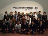 学生団体「RING」(任意の学生団体)は、本学学生を中心に、日本青年会議所の協力のもと2008年11月に設立、2009年に活動を開始した学生団体で、主に「大学生と国会議員のディスカッションを動画で配信する」といった活動を行っています。 4月21日(水)夜、本学 白金校舎 10階大会議場におきまして、【日本青年会議所連携】学生団体RING主催「学生と政治家の懇親会(春)」を行いました。 懇親会には、熊田篤嗣 氏(民主党【衆】)、横粂勝仁 氏(民主党【衆】)、谷合正明 氏(公明党【参】)、津村啓介 氏(民主【衆】)の4名の国会議員の方々が参加し、本学学生約30名や日本青年会議所メンバーと懇談しました。 この会は、国会議員とのアポ取りを含め、企画・運営等のすべてを本学学生が自主的な活動として行い、議員の方々からは「明治学院大学の学生さん、とくにRINGのメンバーのバイタリティには感心している。熱意がある学生さんには、今後とも可能な限りこういった会に参加するなどして、応えて行きたい。」とのコメントをいただきました。 また、学生参加者には今年4月に入学した1年生も多く、「直接国会議員の方々とお話する機会が持てて、とても良い経験になった」と話していました。 学生団体RINGは、今年度も積極的に、さまざまな活動をする予定です。
