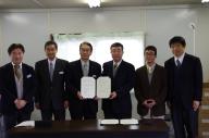 調印式は3月28日午前11時から大槌町の仮設庁舎で行われ、大槌町からは碇川豊町長、高橋浩進副町長、佐々木彰副町長が、明治学院大学からは大西晴樹学長、社会学部教授の浅川達人ボランティアセンター長補佐、三上耕一ボランティアセンター次長が出席しました。
