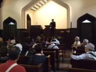 スタートは明治学院礼拝堂。礼拝堂の中で巌谷先生の説明を受けました。木造の高い天井が森の中をイメージするような感じ、窓から差し込む光が木漏れ日のようなイメージ。そのように伺うと、礼拝堂の木製の椅子に座っていると、豊かな木々に囲まれた森の中にいるような安心感に包まれてくるような感じになりました。