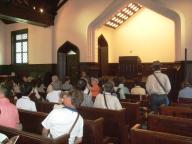 教会堂の設計者は、旧帝国ホテル設計者として知られるフランク・ロイド・ライトの門下生であり、教会員であった岡見健彦。教会堂はライトの流れを汲んで岡見健彦がその理想を教会建築に再現したすばらしい建造物であると巖谷名誉教授より説明を受けました。