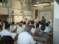 最後に見学したのは柘榴坂上のカトリック高輪教会。この教会堂は明治学院記念館、明治学院礼拝堂、日本基督教団高輪教会とは違う現代建築(1989年竣工。設計:船越徹)です。はじめに教会内にはいり、プロテスタント教会の礼拝堂とカトリック教会の聖堂の様式の違いを巖谷名誉教授から説明を受けました。またカトリック高輪教会は「江戸の大殉教」(1623年)を記念する教会でもあり、このことについて信徒の方から「江戸の大殉教」を題材にした江副隆愛画伯の絵画、殉教記念石碑、キリスト教禁教に関する資料(カトリック高輪教会所蔵)によって説明を受けました。
