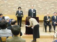 15時から行われた修了式では、修了生全員の紹介のあと、チャレンジコミュニティ大学長の武井雅昭港区長より、修了生代表の髙村資子さんに修了証書が手渡されました。続いて明治学院大学の鵜殿博喜学長、ご来賓のうかい雅彦港区議会議長よりご祝辞をいただき、式の最後に、安田光一さんが第九期修了生を代表して挨拶をしました。