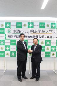 「明治学院大学 自治体推薦入学試験」は、自治体首長より推薦を受けたものを対象としたものです。前途有為な小諸市の高校生を小泉俊博 小諸市長に推薦していただき、本学での学びを通して、地域・社会へ貢献できる人材となることを期待します。