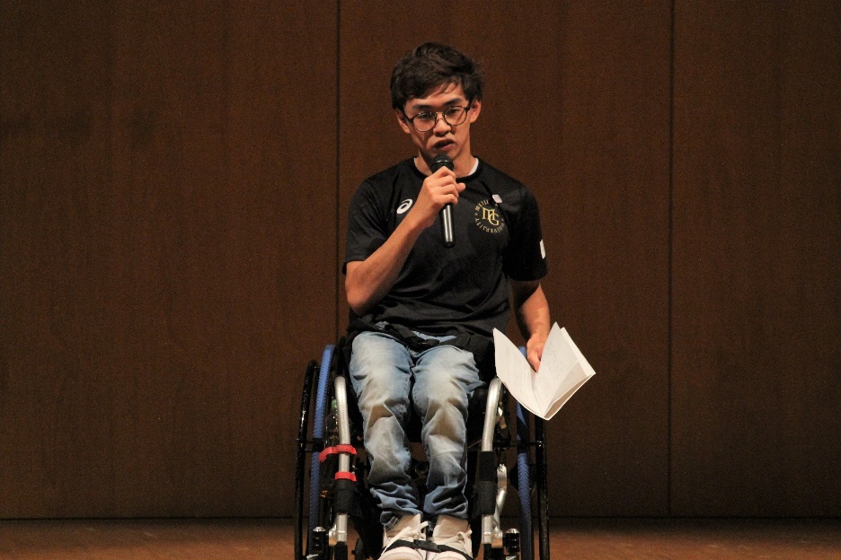 10月21日(日)、港区高輪区民センターにて本学應援團主催の第52回チャリティーショー「白金の集い」が開催されました。 應援團のステージに始まり、Acoustic Minds、落語研究会、手話サークルぽっけ、地唄舞普及協会、青山学院大学應援團、東北学院大学應援團などが参加。 さまざまなパフォーマンスや本学應援團のユーモア溢れるアナウンスで会場は大盛り上がりでした。 MGオリンピック・パラリンピックプロジェクト実行委員会からは、本プロジェクトのメンバーであり、競泳で東京2020パラリンピック競技大会の出場を目指している海老塚主税さん(社会学部社会学科1年)がスピーチ。競技のルールをはじめ、水泳を始めったきっかけや所属するチーム、そして自身の水泳に対する想いを語りました。その後、本プロジェクトの別メンバーからも本プロジェクトの活動を簡単に紹介しました。 ご来場の皆様からは、本プロジェクトに対する期待の声をいただきました。 今後もMGオリンピック・パラリンピックプロジェクト実行委員会は、東京2020オリンピック・パラリンピック競技大会の成功に向け、全力で取り組んでまいります。今後の本プロジェクトに活動にご期待ください。