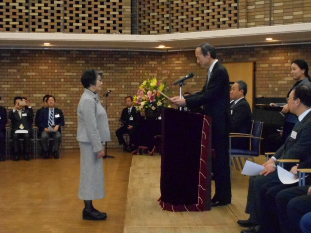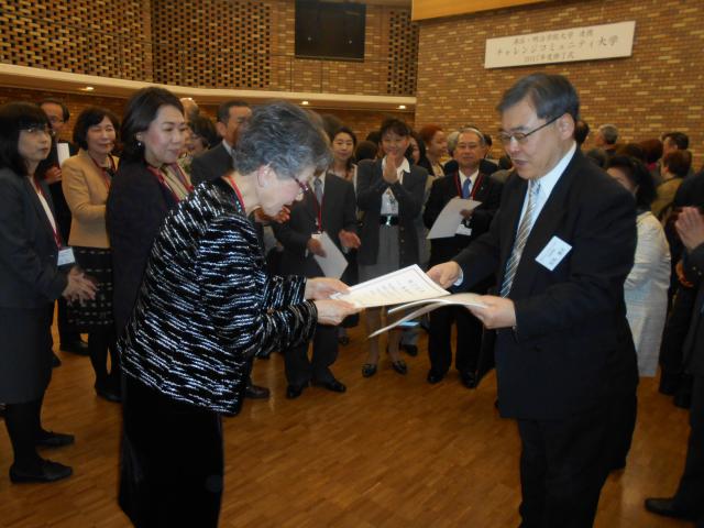 修了生を代表して香取志津子さんがチャレンジコミュニティ大学 学長 武井雅昭港区長より修了証書を受け取りました