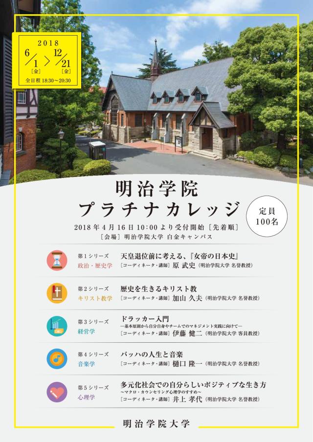 明治学院大学では2018年度より、新たな生涯学習講座「明治学院プラチナカレッジ」を開講いたします。