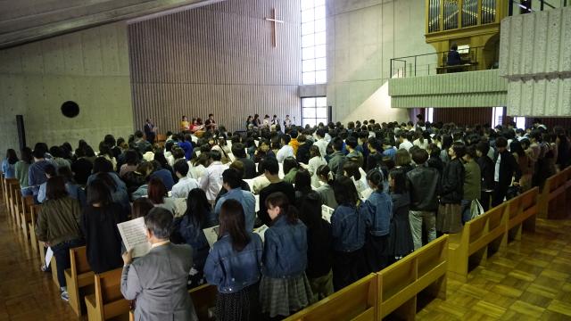 「MCM(Meigaku Chapel’s Members)」や「ヘボン聖書研究会」の協力もあり、盛況のうちに終了したイースター礼拝&ギデオン聖書贈呈式。