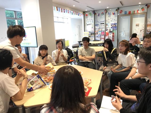 お菓子を食べながら少人数の班で交流する時間も設けました。私たちはあらかじめ質問を考え、外国人からみえる日本の姿や、東京2020オリンピック・パラリンピックの話など、お菓子を食べながら少人数の班ごとに交流を深めました。